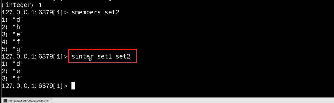 获取两个集合的交集 命令:sinter set1 set2