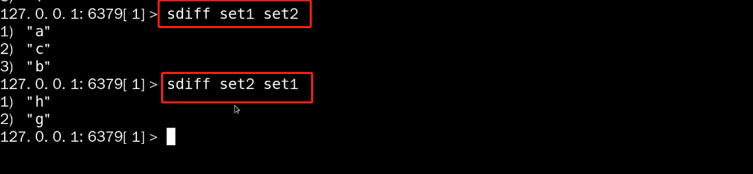 sdiff--差集 set1 set2(差集的使用是有前后顺序的,表示前面集合中有,而后面集合中没有的元素)