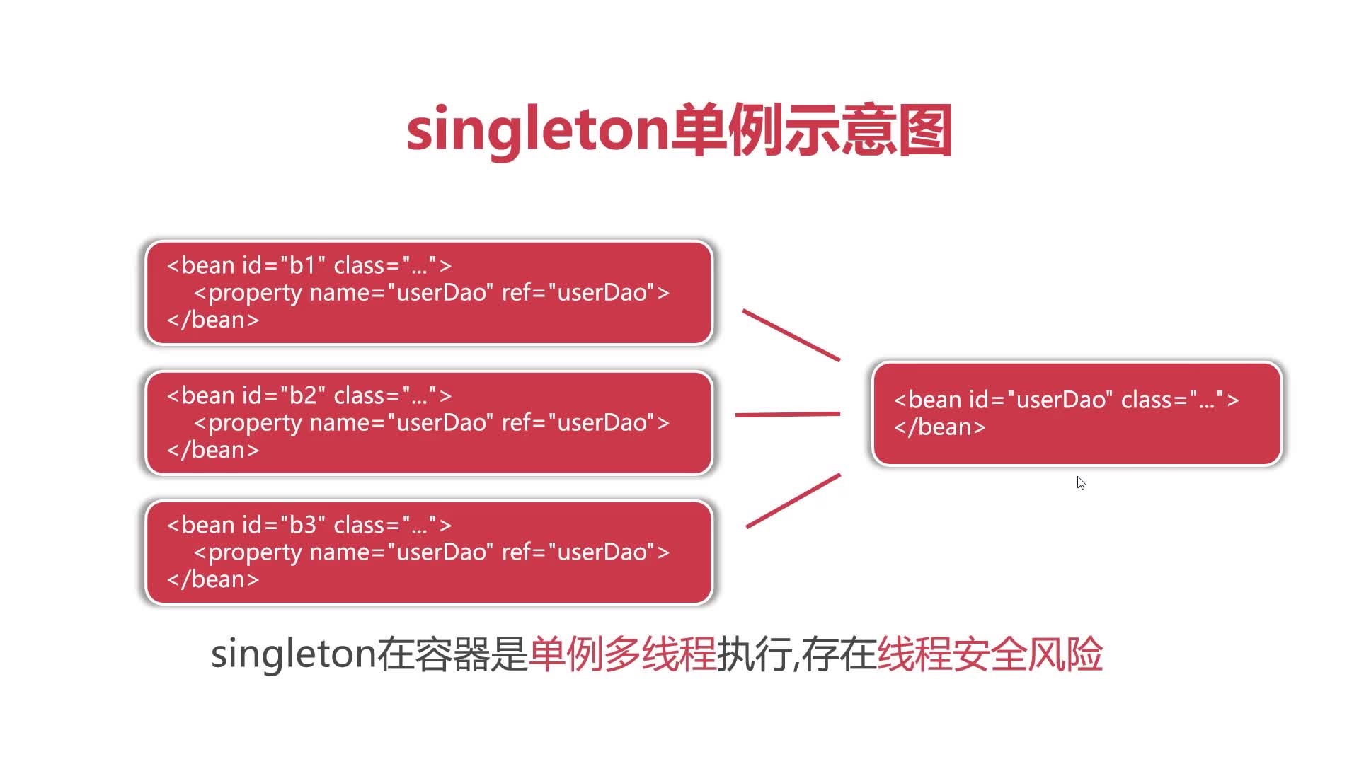 scope=singleton的意思是,每当我们使用context.getBean(beanId),获得都是同一个对象,也即单例模式,不过在容器中是单例多线程执行,这样可以使得不同的对象同时ref同一个单例,但是存在线程安全风险。