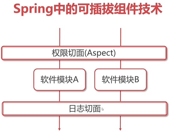 - 正常软件业务流程是从上到下依次执行的,我们加的功能就像横切面一样穿加在原始软件的运行过程中