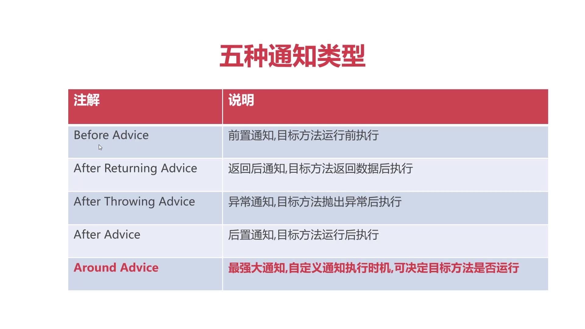 前4种做了解,知道触发时机即可,Around Advice做重点掌握