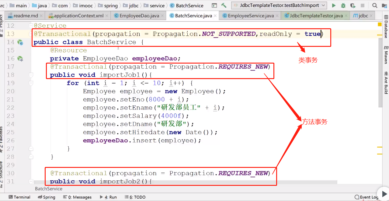 单独定义 指定 方法的事务机制:(如果,方法和类上同时“注释”了事务的传播机制,执行方法时,以方法上“注释”定义的事务传播机制为依据)