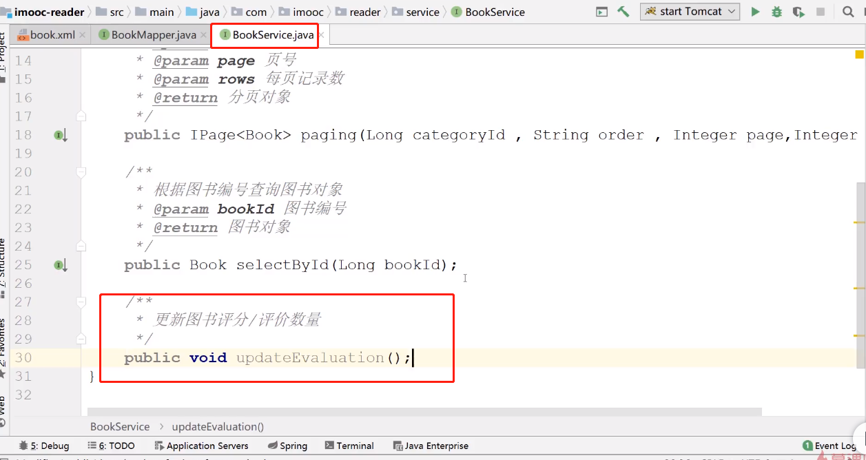 第三步,在bookservice 接口中,创建更新图书评论评分/评论总数的方法