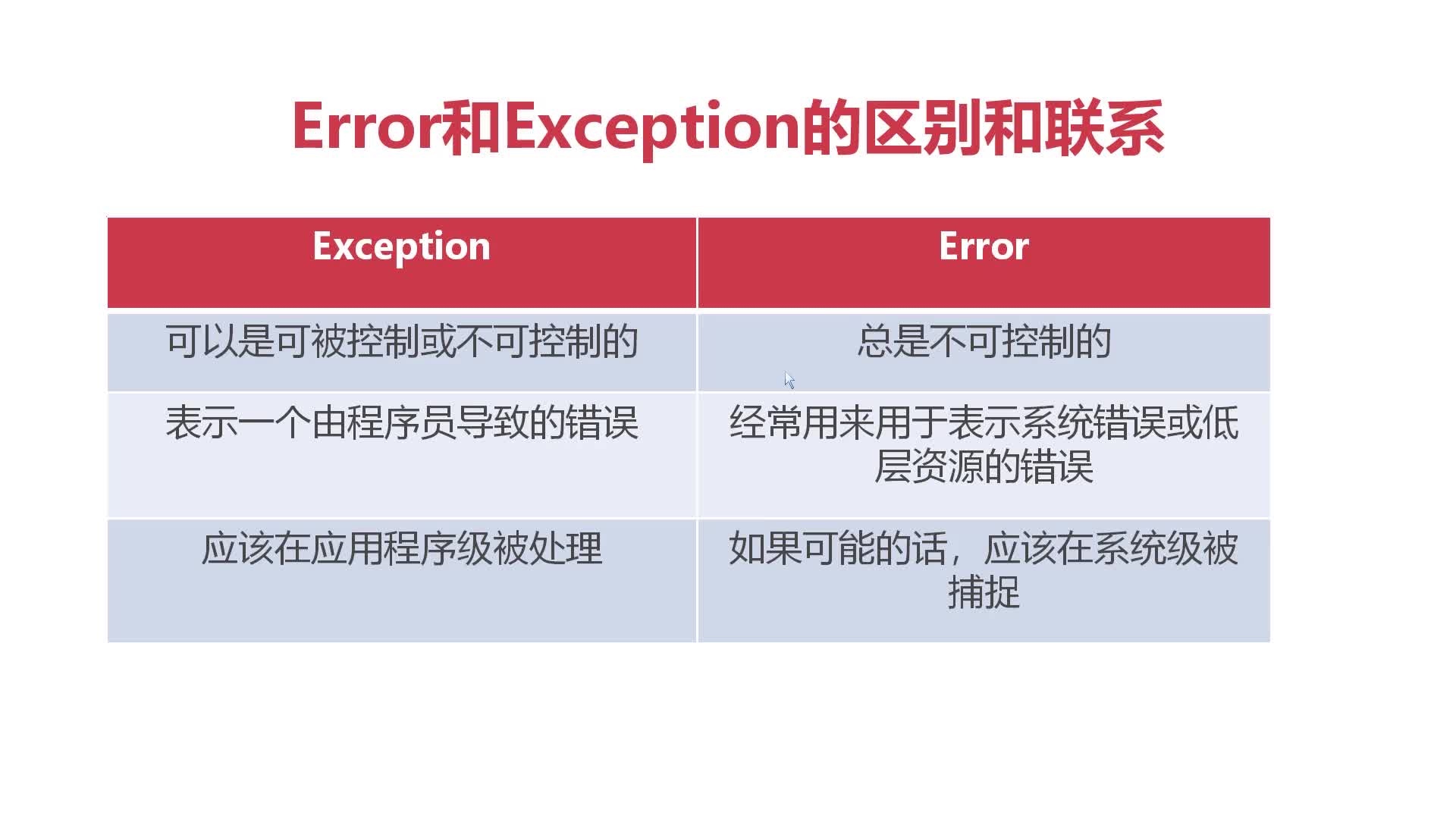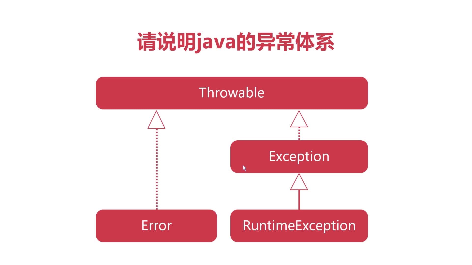 1,最顶层的抽象是一个Throwable接口:代表了任何可以被抛出的异常或错误 2,error--是操作系统级别的错误,需要终止程序运行解决。