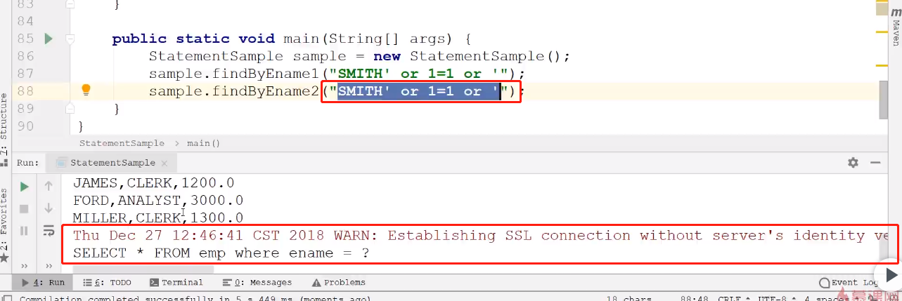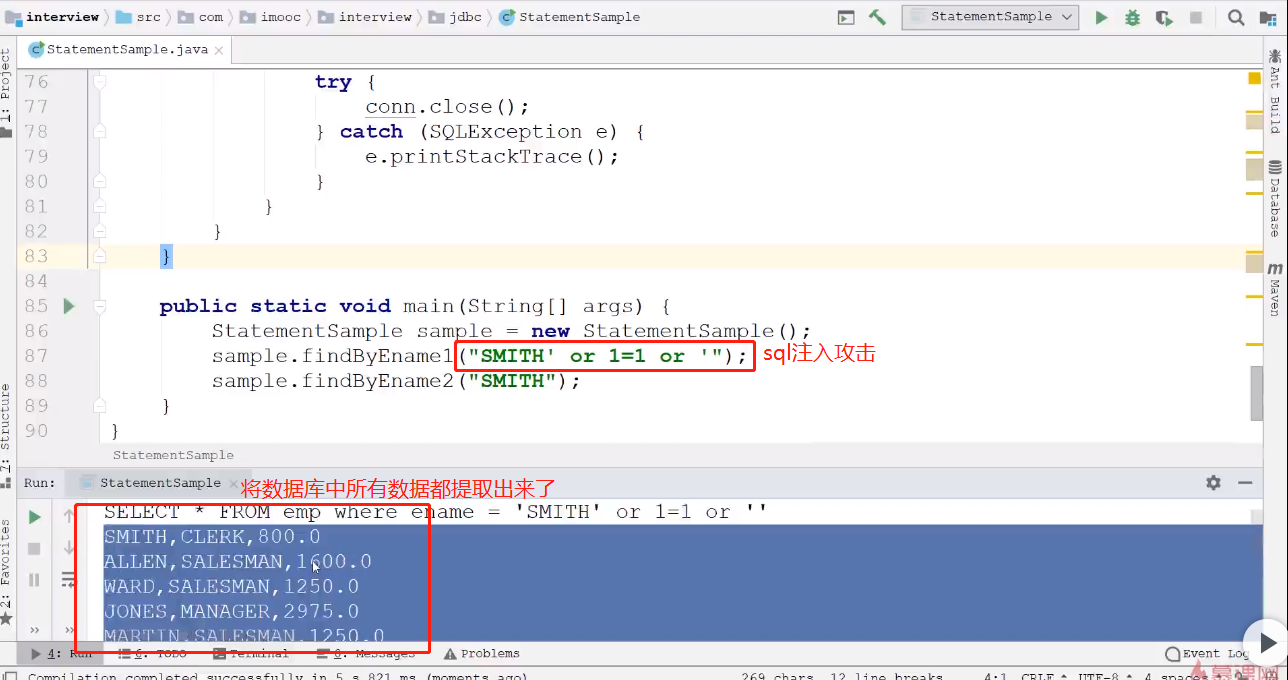 SQL注入风险:SQL注入是专门针对Statement设计的。因为其是靠字符串拼接创建SQL语句的。所以对特殊字符没有做任何处理。
