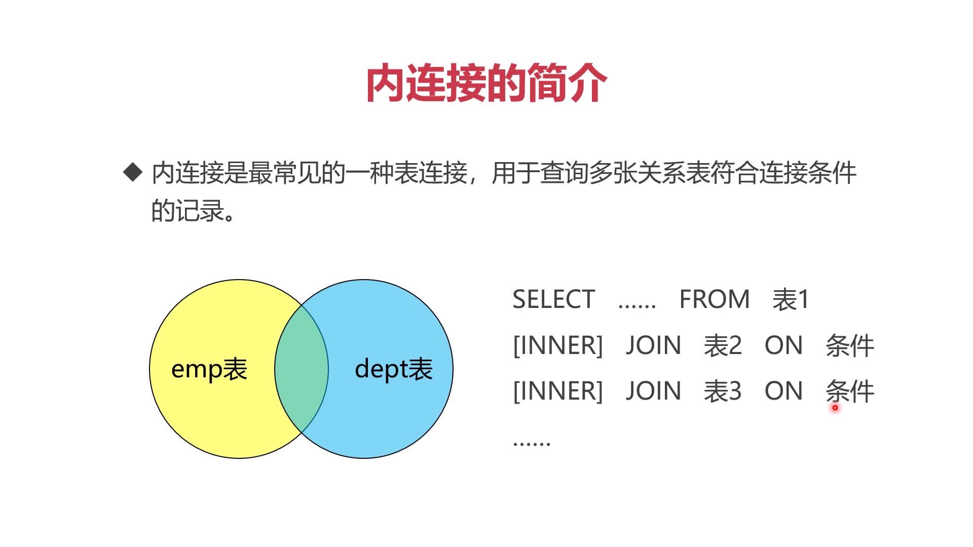 join,其实就是“inner join”,为了简写才写成join,两个是表示一个的,内连接,表示以两个表的交集为主,查出来是两个表有交集的部分,其余没有关联就不额外显示出来,这个用的情况也是挺多的,如下