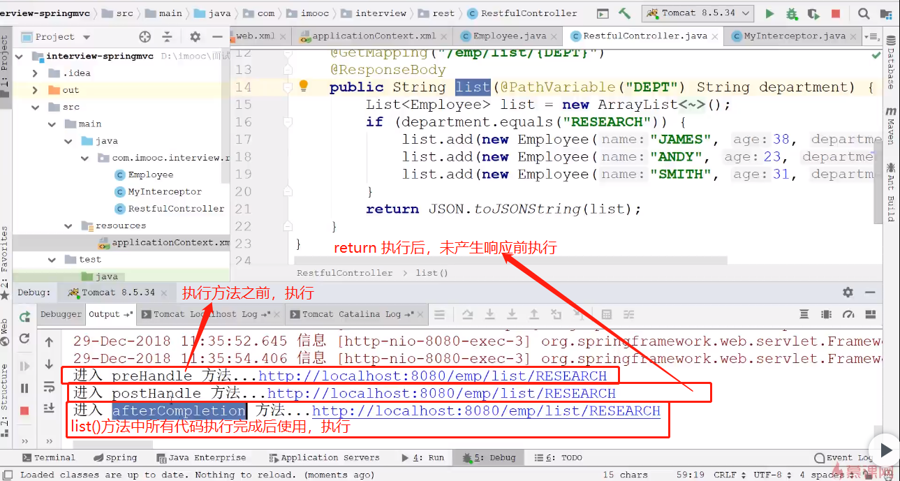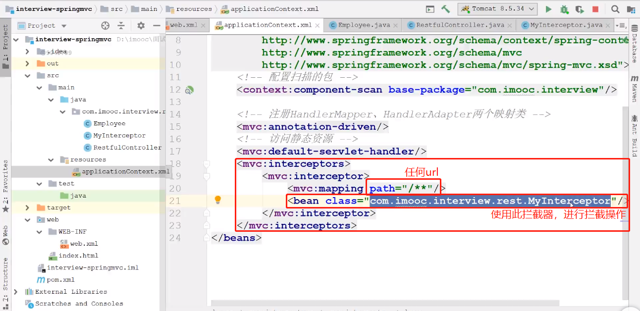 示例: 配置拦截器applicationContext.xml 执行结果: 拦截器使用场景:权限控制,登录拦截,字符集管理,国际化等。可以做到不修改源代码的情况下实现响应功能。