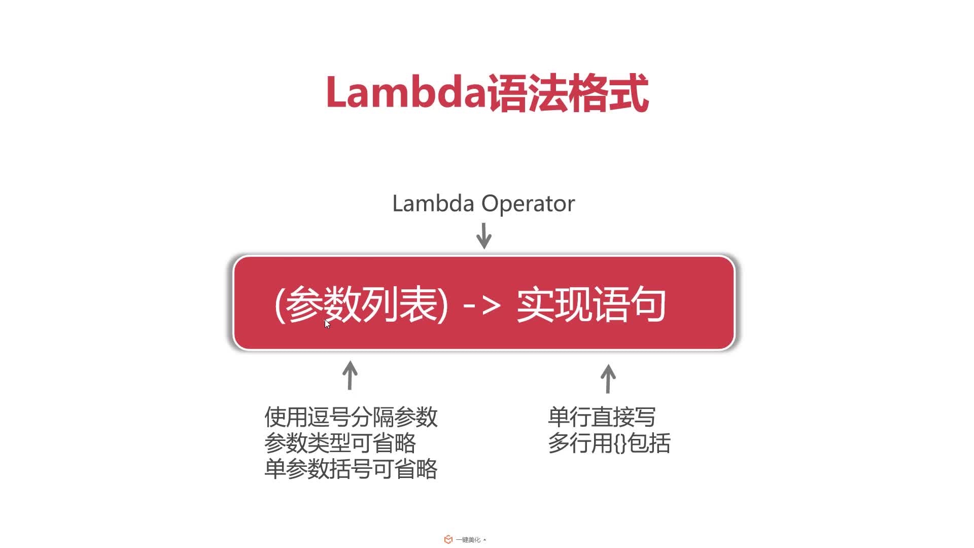 注意: lambda表达式只能实现有且只有一个抽象方法的接口,java称为“函数式接口”