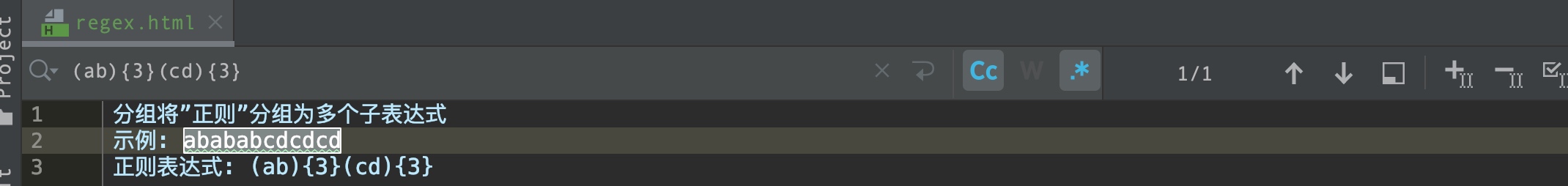 我们一个大表达式进行拆分,它的使用方法是例如原始字符串ababcdcd那么现在我的要求对这个字符串要进行匹配的时候,该怎么做呢?在这里我们就使用了表达式分组,表达式分组它一个典型特点就是用小括号将一个子表达式进行包裹,分组出来的子表达式,它的优先级是最高的,同时也会作为一个整体进行匹配。在以前我们都知道像这种它只能针对于单个字符描述它重复的次数,但是如果增加一个分组以后,那么就可以将分组来进行重复的匹配了。