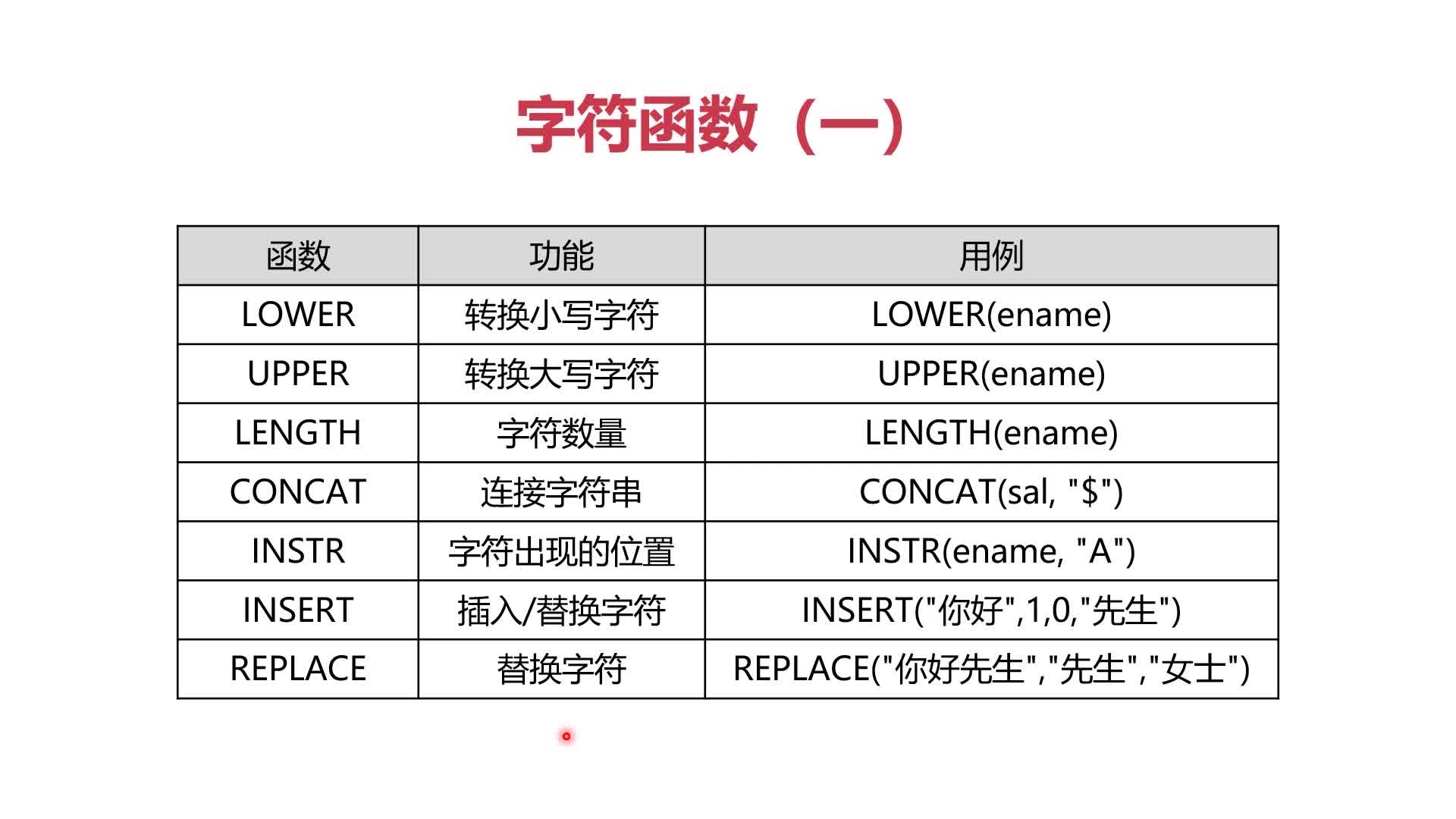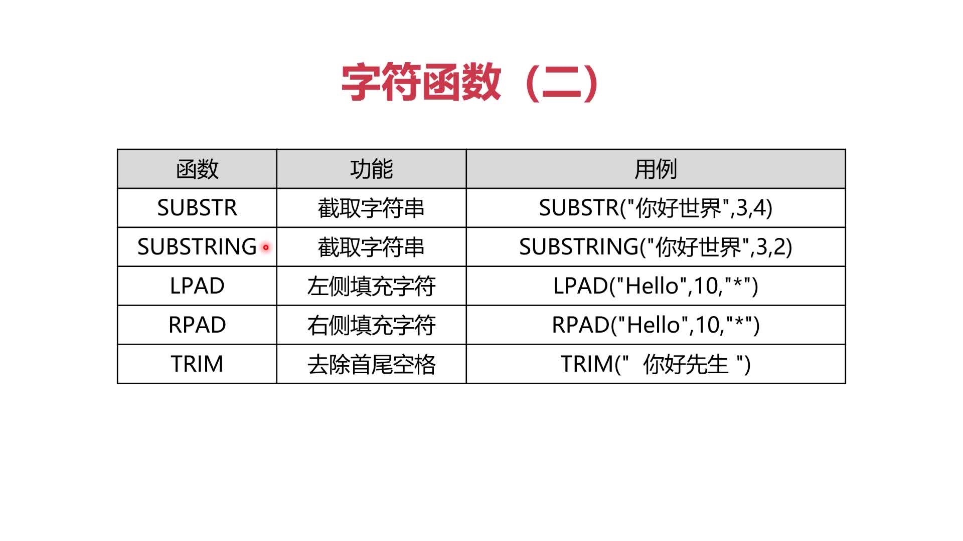 SUBSTR(“你好世界”,“3”,"4")-->参数1,被提取的字符串,参数2-》提取字符串开始的位置,第3个参数--》提取字符串结束的位置。。
