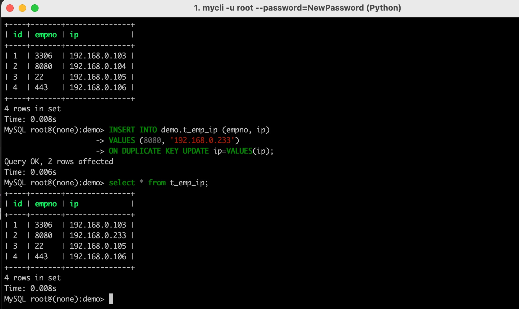 ON DUPLICATE KEY UPDATE ip=VALUES(ip);