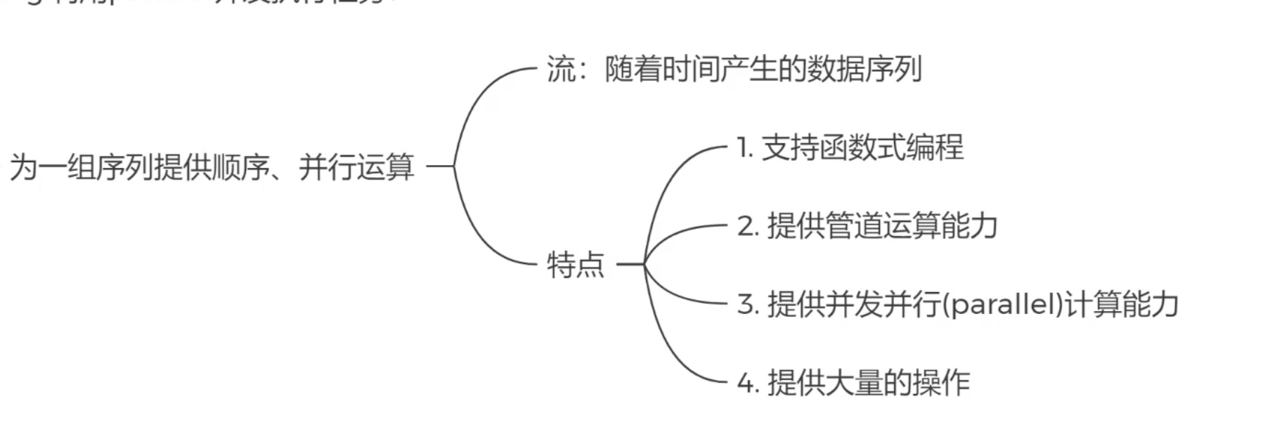 然后我们经常会收到各种各样的比如说文件流、字库流、网络流、信息流、订阅流这些我们都称之为流,他们的特点就是他们会随着时间产生数据,然后他们是个序列,所以有序列我们就可以按照一个一个的对流进行操作。而stream的接口我们其实是在为一组序列去提供顺序计算及并行的运算。